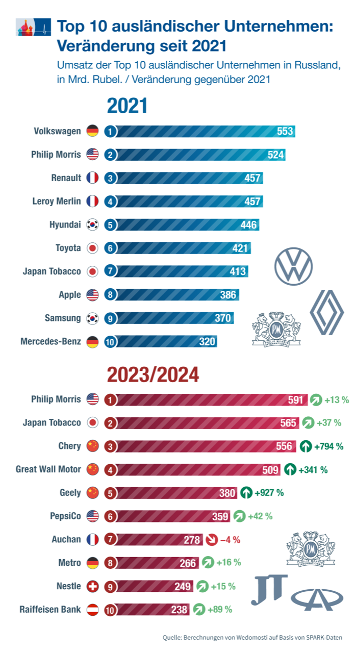 Der deutsche Autobauer Volkswagen hat von allen ausländischen Unternehmen, die bis 2022 in Russland tätig waren, am meisten Umsatz eingebüßt. Das schließt die Wirtschaftszeitung Vedomosti aus dem Umstand, dass Volkswagen vor 2022 das umsatzstärkste ausländische Unternehmen in Russland war und danach das Land verlassen hat. Mit damals 553 Mrd. Rubel, nach aktuellem Kurs rund 4,8 Mrd. Euro, wäre es auch in den Jahren 2023/2024 unter den Top-Unternehmen, hinter zwei ausländischen Tabakkonzernen, die in Russland geblieben sind, und zwischen zwei chinesischen Autobauern (siehe Grafik). Über weitere Ergebnisse der Unternehmens-Studie von Vedomosti haben wir am vergangenen Donnerstag im Morgentelegramm berichtet. / Vedomosti (RU)